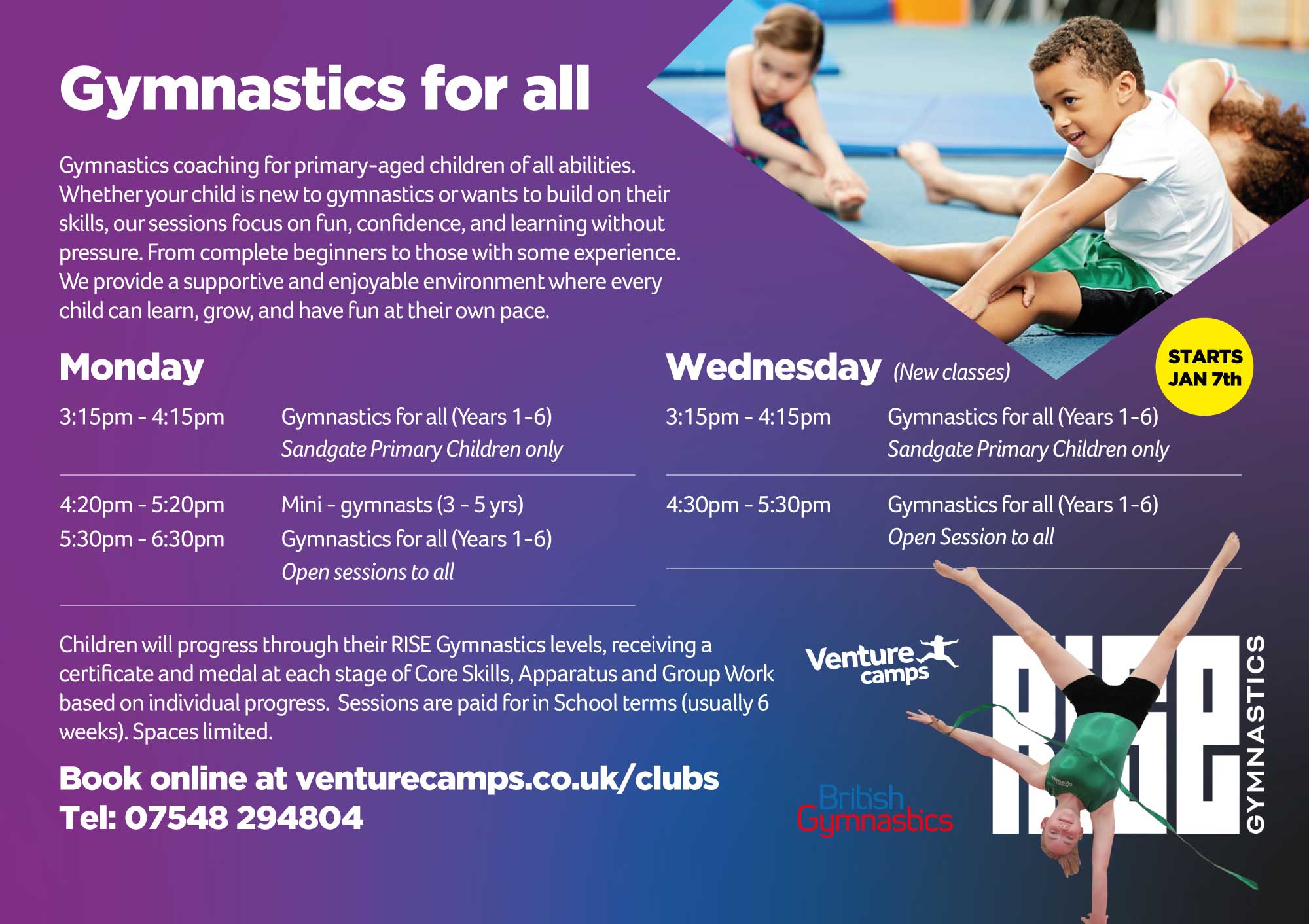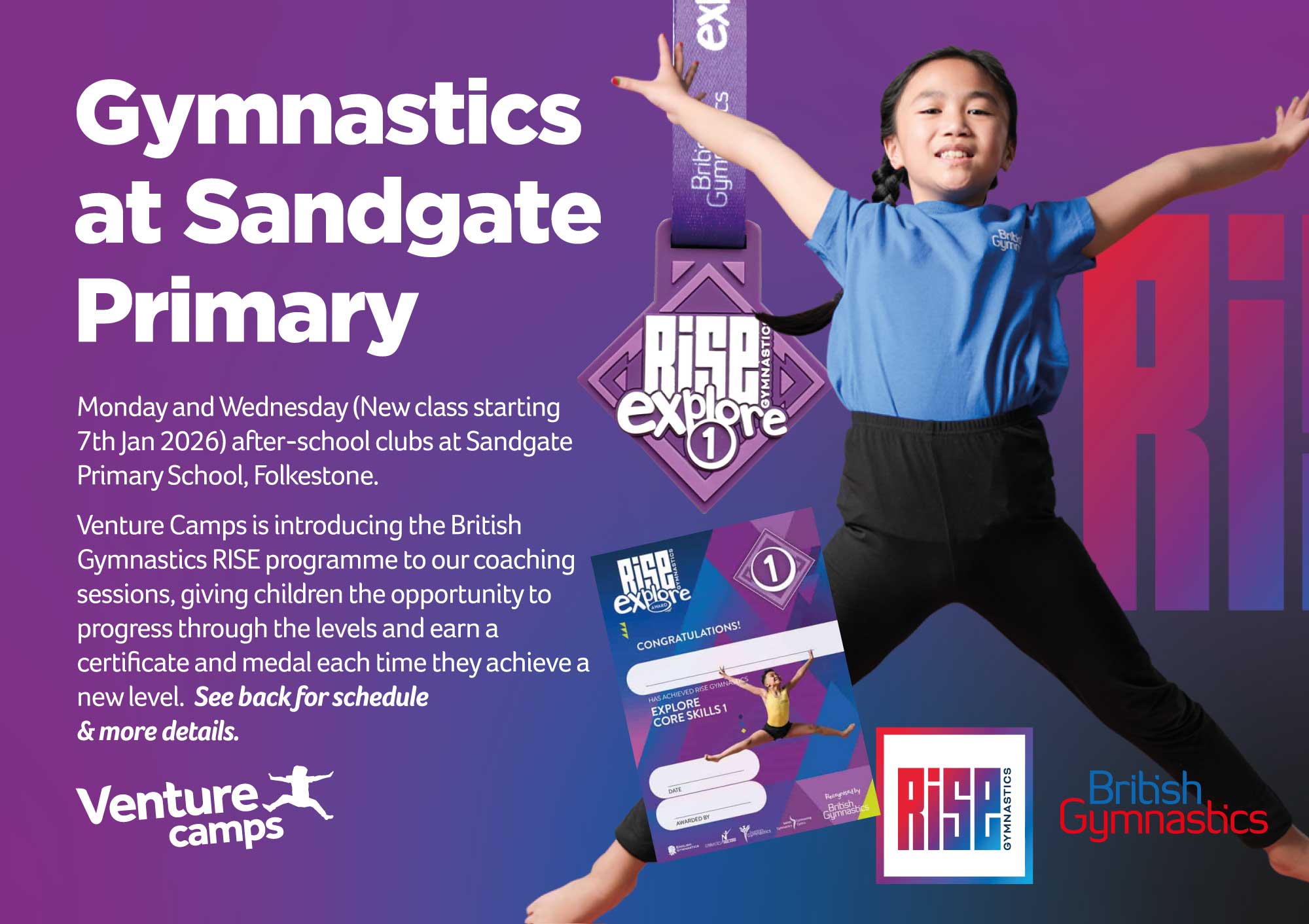 Monday and Wednesday (New class starting 7th Jan 2026) after-school clubs at Sandgate Primary School, Folkestone. Venture Camps is introducing the British Gymnastics RISE programme to our coaching sessions, giving children the opportunity to progress through the levels and earn a certificate and medal each time they achieve a new level.